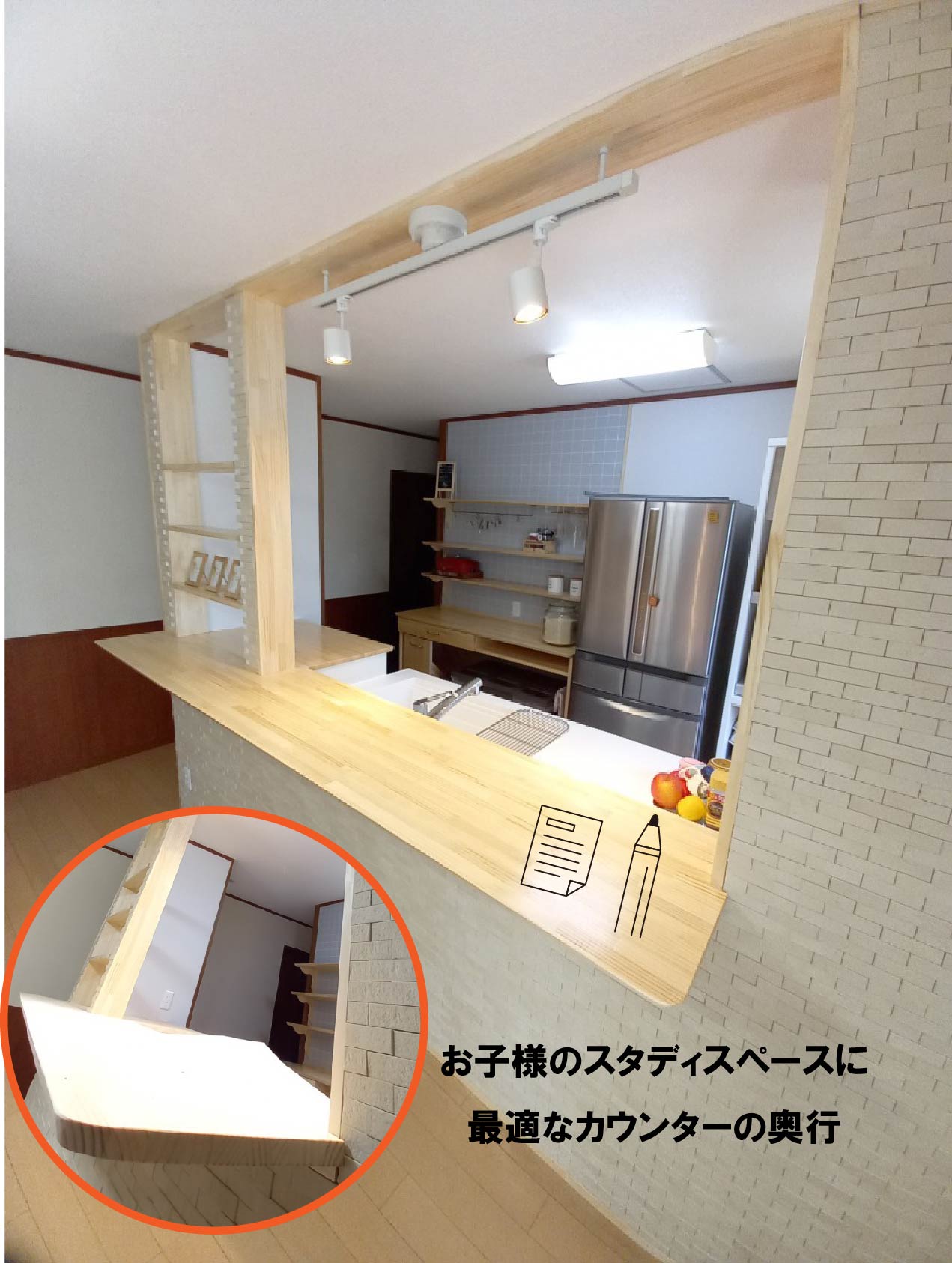 工事に入る際「小学生のお子さま2人が宿題をやるスペースがなくどうにか近くで見てあげるスペースが欲しい」とお話を伺っていたので、この空間の中での動線を考えキッチンで作業しながらお子様がノートを広げられるスペースとして、対面キッチンのカウンターの奥行を通常より長く出すことをご提案させていただきました♪