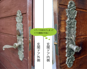 今回玄関ドアの内側のドアノブが折れてしまい開け閉めがしにくくなったドアノブの交換を承りました。